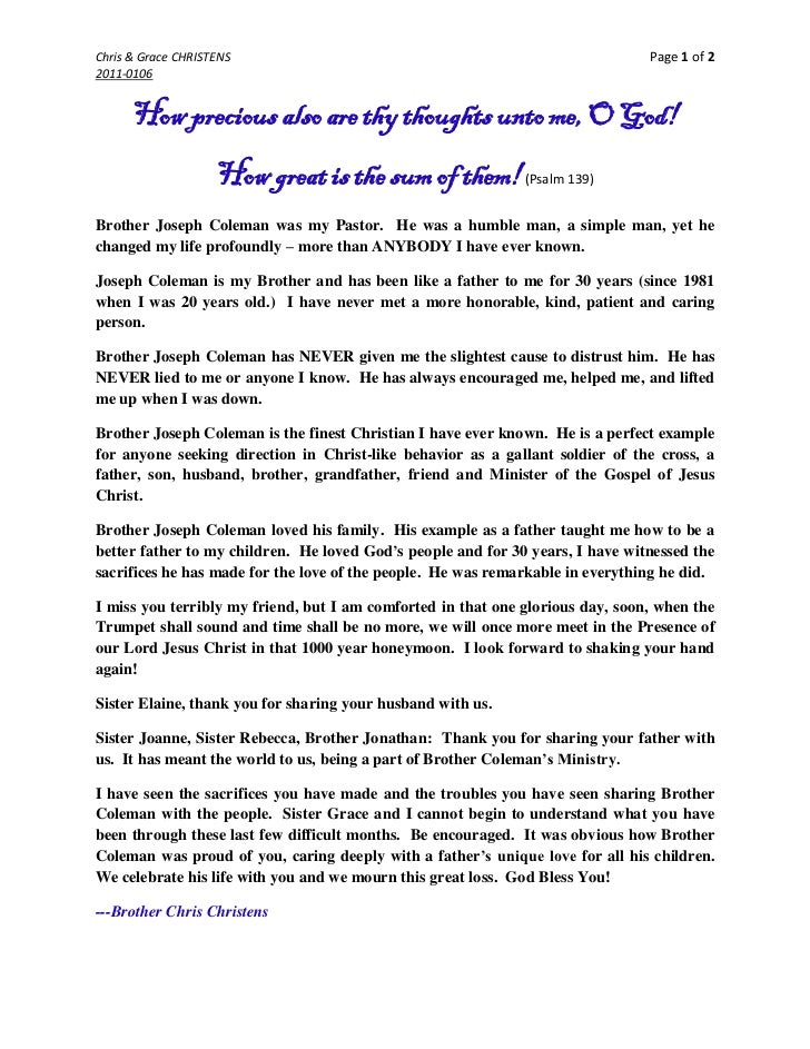 Another tribute to a pastor is a tribute to Eric Sims that thanks Sims for following God's heart. A member of the congregation offered the Tribute to Pastor Scruggs in a speech.